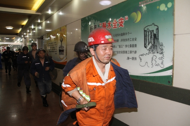 上午8时,演练正式开始。调度员接到8307三四分层工作面上端头向下15米处顶板出现溃水事故,水量急剧增大并危及现场人员人身安全的报告后,立即按十项应急处置权做出安排:立即停产撤人,并利用群呼系统和语音广播系统3分钟内通知到下井各作业地点和机台岗位,组织人员沿避水灾路线撤人。同时命令运输工区做好人员提升准备;命令井下中央泵房开启所有水泵、关闭防水闸门,命令中央变电所切断受水害威胁区域的电源。8:04,调度员立即向值班矿长、鲁泰煤业公司及市煤炭局调度值班领导汇报。接调度电话后,刘岭矿长迅速来到调度指挥中心,命令立即拉响警报并启动应急预案,成立以矿长为总指挥的应急救援指挥部。8:13,拉响警报,各救援小组3分钟内集结完毕。各小组组长3分钟内在调度指挥中心到齐后,总指挥刘岭作出重要部署。各组人员立即按照要求迅速进入应急演练状态,严格按职责分工投入到抢险救援工作中。井下人员按照避灾路线陆续撤离,58分钟内全部升井。对未能按时升井的1人,立即组织紧急施救,确保人员全部安全撤离。演练现场,应急指挥部各成员单位反应迅速、通力配合,整个演练过程组织严密、紧张有序、指挥有力。9:30,受困人员成功安全升井。经现场施救后,送往医院。总指挥刘岭宣布2013年应急预案演练圆满结束。